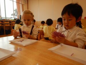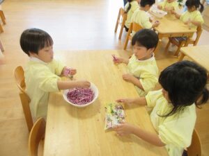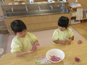 年少さんみんなで、給食で食べる”菊のはなびら”を取るおてつだい…(^^)/