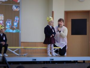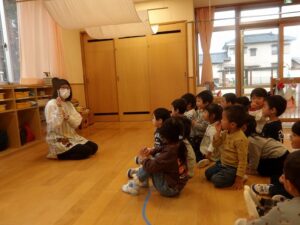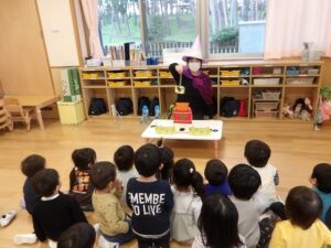 園長先生のお話…さつまいもを掘ってみんなで収穫をした話や、ハロウィンの収穫祭の話を聞きました。
