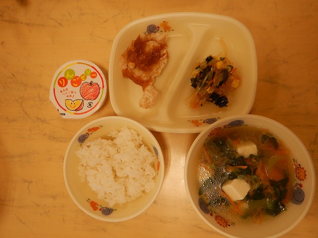 給食は<ごはん・とりにくのからあげ(こうみソース)・ちゅうかサラダ・ちんげんさいのスープ・フルーツゼリー>です。