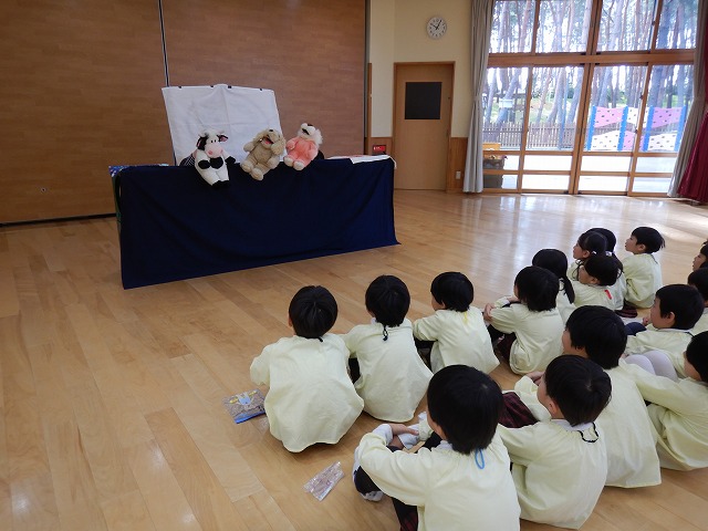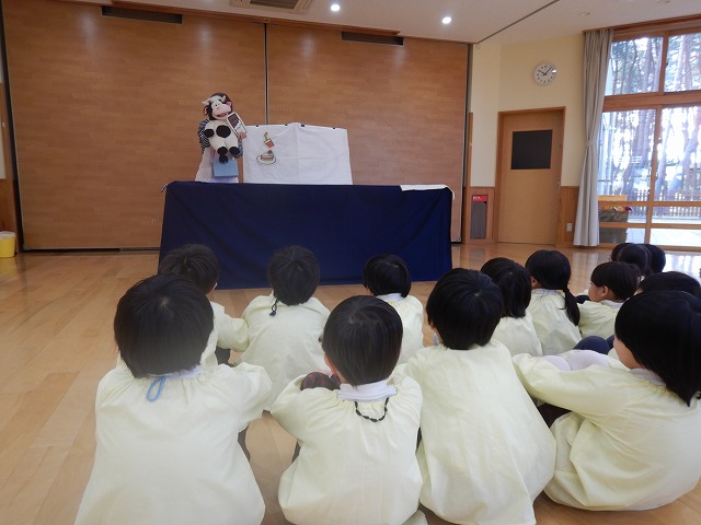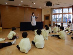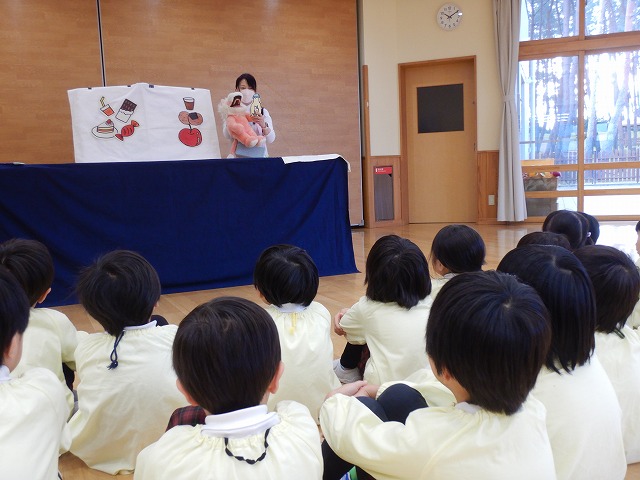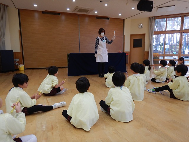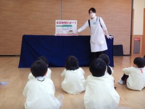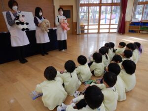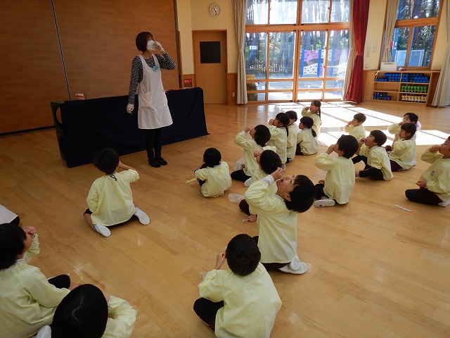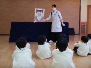むし歯はどのようにしたらできるのか、人形劇で教えてもらいました。