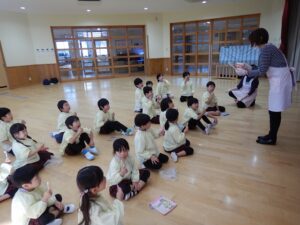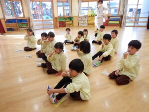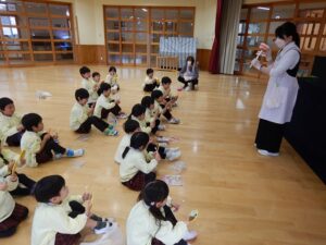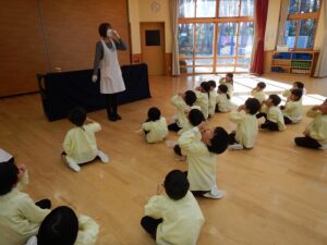 給食後もうがいをする際に「ブクブクうがいしなくちゃ!」といつもよりも丁寧にうがいをしていました。また、「歯磨きのやり方、ママに教えてあげよう!」「仕上げ磨きもしてもらおう!」と教えてもらったことを家庭でも実践しようとする言葉が聞かれました。