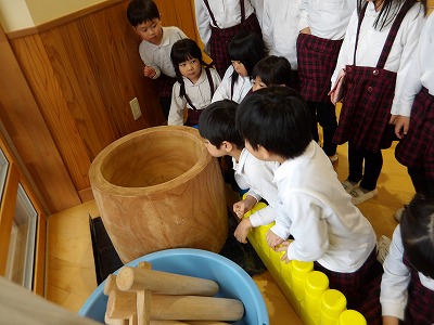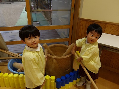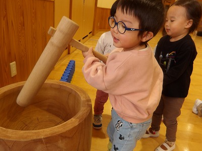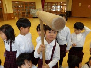 もうすぐもちつき会♪ もうすぐもちつき会。ホールに臼と杵が出してあるのをみると 「もちつきするのだよね!」「年長さんがつくんだよね」ともちつきを楽しみにしています。 杵を持つと「ちょっと重いね…」「年長さんすごいね」との声がきかれています。 ついた餅は鏡餅にし園内に飾ります。 当日は、餅でつくったおかきを食べる予定です。 もちつき会当日をみんなで楽しみに待ちたいと思います。 投稿日:2025.12.11 | カテゴリー:園からのお知らせ