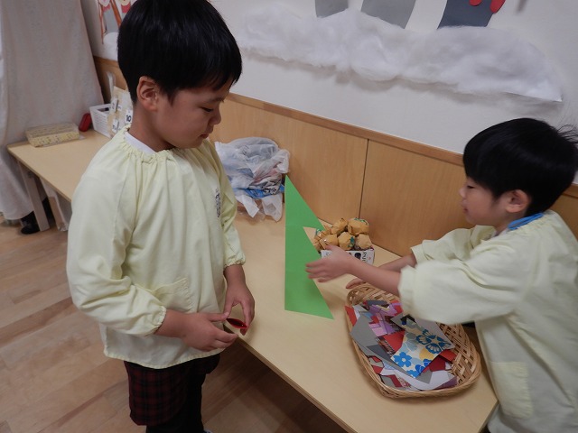 保育室にツリーの形の画用紙があるのをみつけた子どもたち。