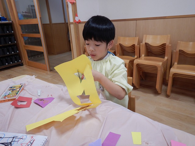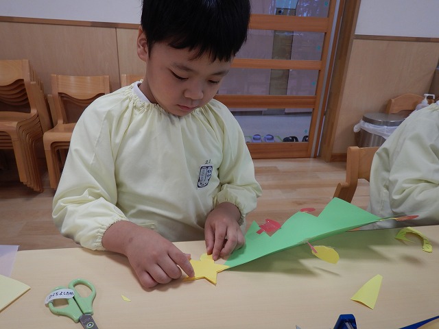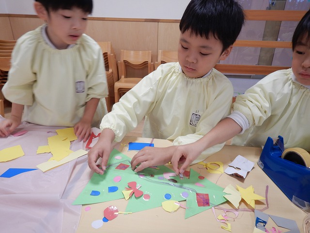 身近にあるツリーを思い出し、画用紙や包装紙でどんどん飾りを作っていた子どもたちです☆