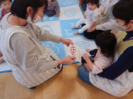 手遊び『もちっこやいて』をしました。びろ~んといろんなお餅を食べておいし~♡