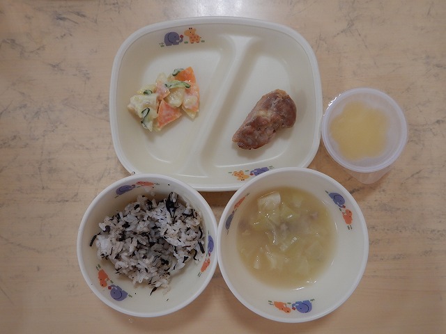 給食は『ひじきの混ぜご飯、鶏肉の照り焼き、さつまいもサラダ、みそ汁、フルーツゼリー』でした。