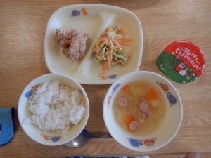 この日の給食は、ごはん、とりにくのからあげ、クリスマスサラダ、ポトフ、クリスマスゼリーでした。