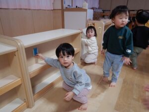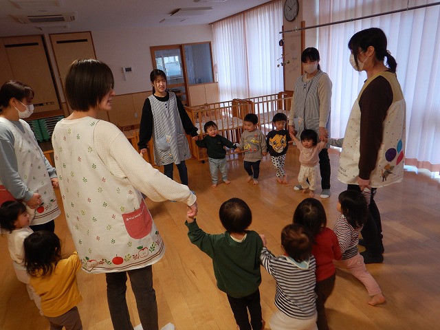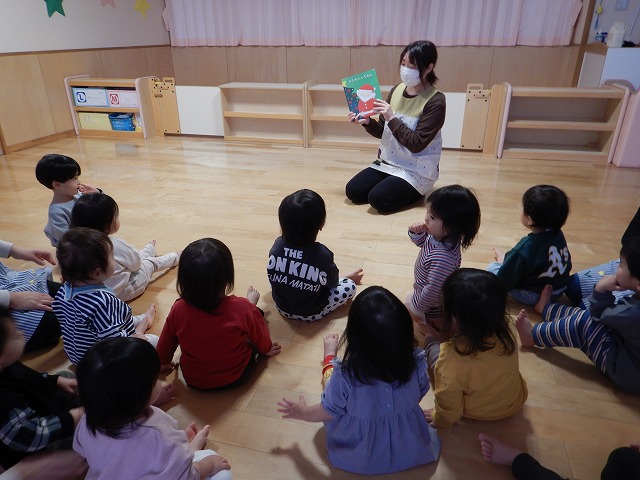 お部屋ではクリスマスの絵本を見たり触れ合い遊び「ジングルベル♪」をしたり。