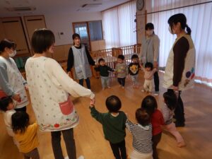 みんなで赤鼻のトナカイの触れ合い遊びをサンタさんと一緒に楽しみました!