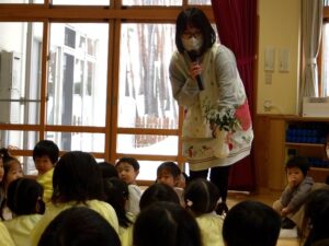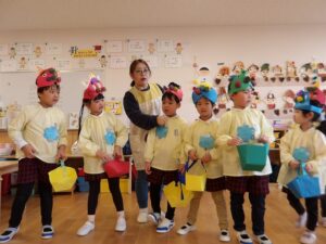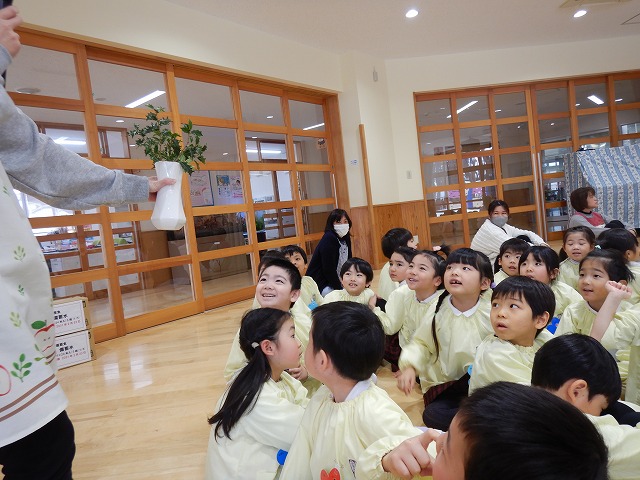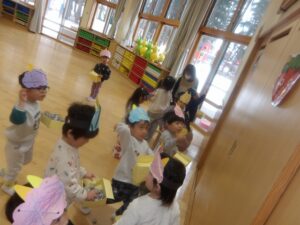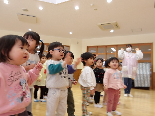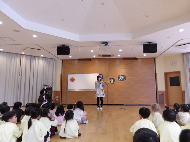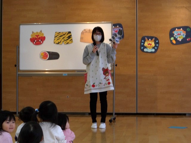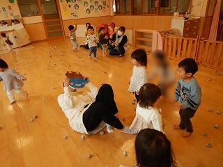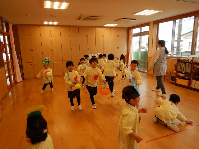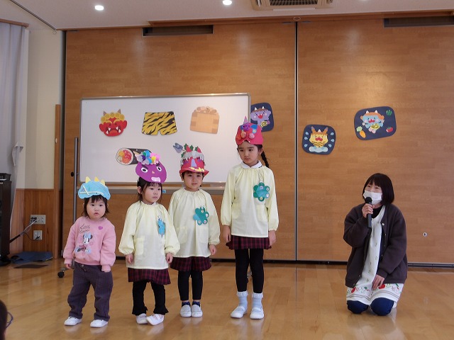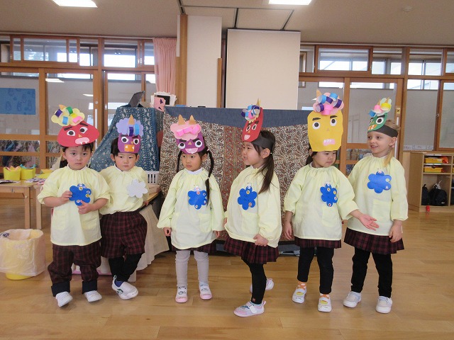 きのめ組さん、つぼみ組さんは、ホールで豆まきを楽しみました。