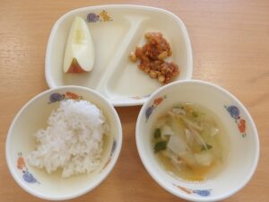 給食では、「鶏肉と大豆のごまソース」をいただきました。