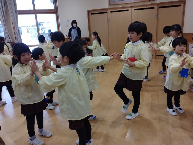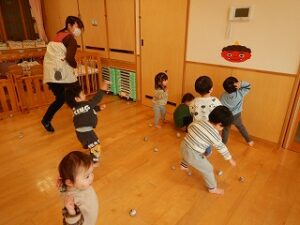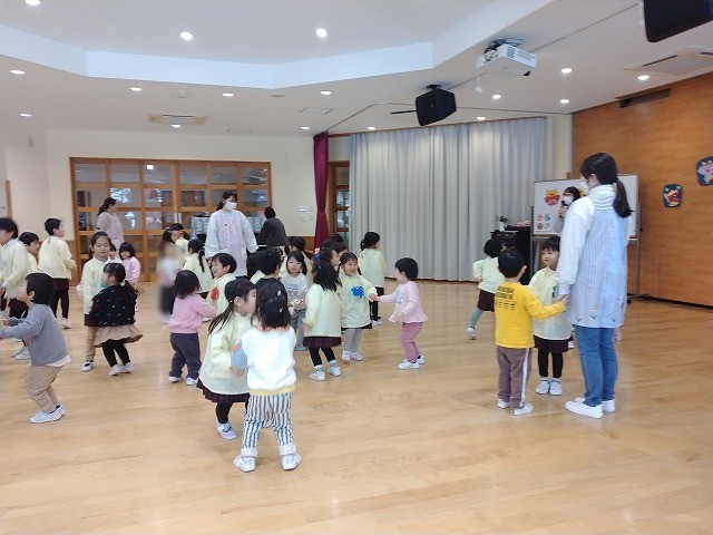 また、「おにのパンツ」の曲に合わせた触れ合い遊びや、「豆まき」の歌を歌いました。