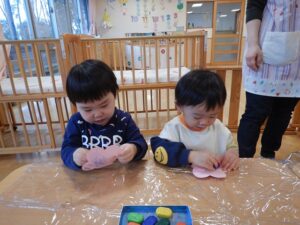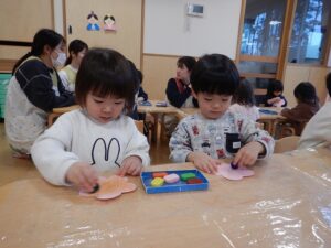 わかば組では、桃の花に好きな模様をクレヨンでお絵描きをしたり、シールを貼ったりしました。