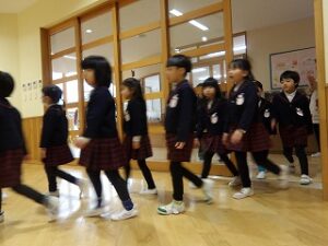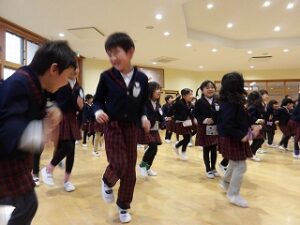 制服を着た子どもたちがホールに集まり、体操をしたり園歌を歌ったりしました。